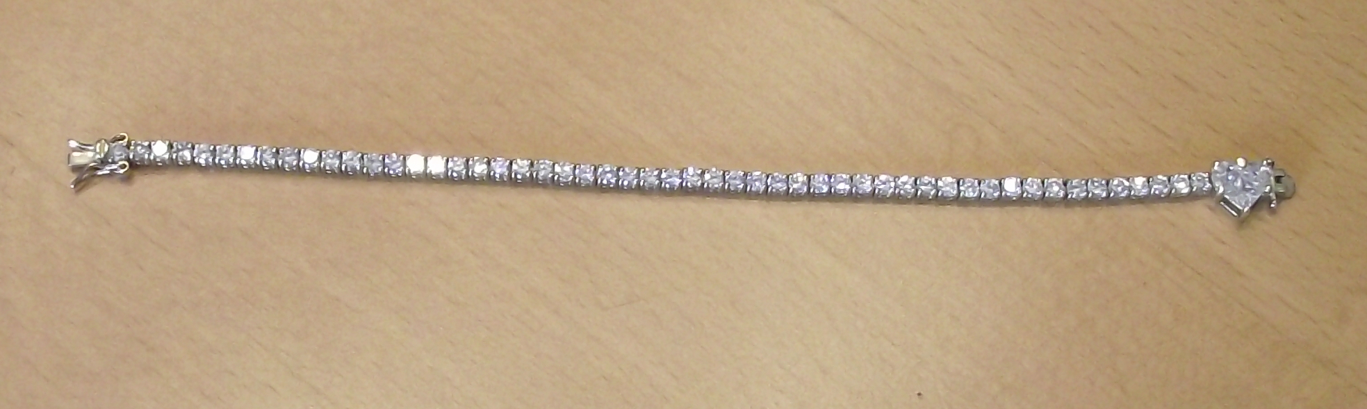 This is a very pretty 7" cubic zirconia tennis bracelet, found in a used camper that my boyfriend and I recently purchased. I'd love to keep it, but I have a metal allergy and can't wear jewelry. It's very shiny and sparkly and in great condition. It's not 14k gold, but gold plated. None of the plating is worn off; it is like brand new condition. I don't know a whole lot about jewelry - it says "SZ8" on the clasp, so perhaps it is a size 8 even though it is 7 inches? There are 53 stones in total, for anyone who is curious - the small ones plus the larger heart-shaped stone.